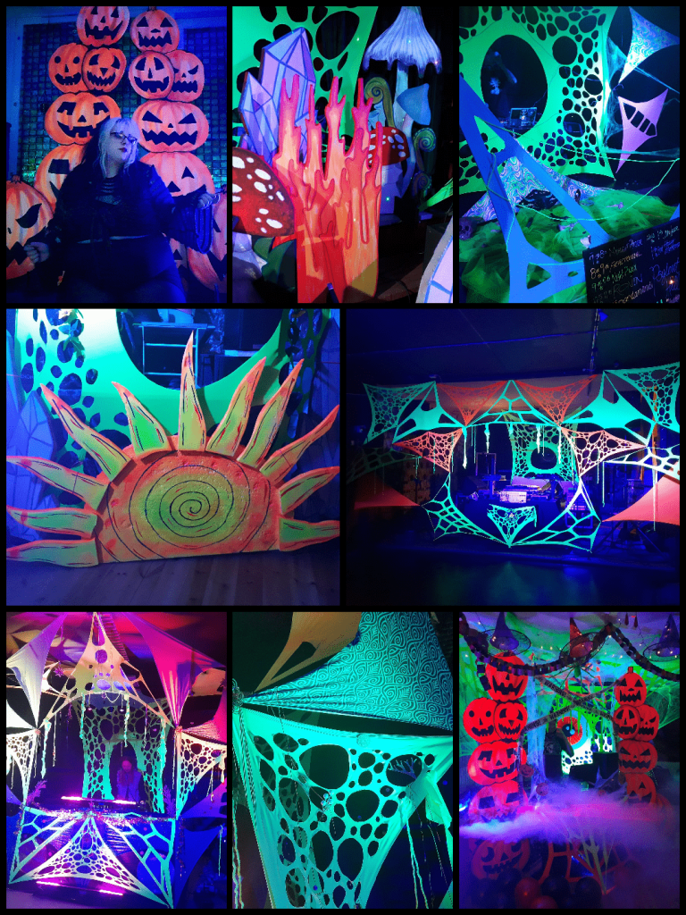 In addition to these arts & crafts, I have also been working as a psychedelic deco artist since 2013. I design and build immersive UV environments for rave parties. I’ve built stages, DJ booths and chill rooms all over the Midwest and South Eastern USA including in Indiana, Kentucky and Tennessee as well as in Southern, Eastern and Western Finland. I have been organizing my own parties and festivals occasionally since 2016.